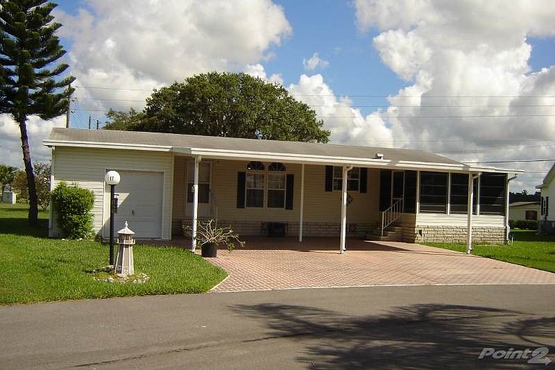 This is a gated 55+ community on lot leased land. This one-owner home is being sold somewhat furnished and can be available for immediate occupancy. Updates and special features include a spacious, open floor plan, tape & textured walls in the living/dining area, master bedroom suite with his and hers closets as well as individual sink and vanity areas in the adjoining bathroom, front facing 10x12 vinyl windowed lanai, double driveway with covered front patio, and a 10x12 shed with overhead door to accommodate the Club Car golf cart that is included with the home purchase. This home sits on an outer perimeter, oversized lot in one of Polk County’s attractive, 55+ gated communities focusing on the active retiree. There is a 9 hole regulation golf course, a putting green, Pro shop, tennis courts, a heated pool, shuffleboard court, fitness center, television & card room, billiard room, and more. Call the listing agent today to see this great find first hand to fully appreciate its value in today’s retirement home market so you, too, can begin enjoying FL living.