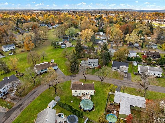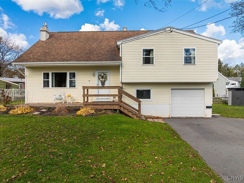 It could be the one! Situated on a wide lot in the desirable Bayberry neighborhood in Liverpool, this beautiful buttercup yellow residence features a welcoming front porch that invites you in to a spacious split-level floorplan, highlighted by hardwoods. Step inside to discover a fully remodeled kitchen, complete with modern appliances, granite countertops, gas stove and stylish finishes. Leading through a door in the kitchen, is the newly added wood deck and above ground pool for summer fun! The living and dining combination is centered by a cozy gas fireplace, creating a warm atmosphere for gatherings. Retreat to the generous primary bedroom, which boasts an en suite bathroom for added privacy and convenience. Three additional, sizable, bedrooms are fitted with their own second full bathroom. An additional family room or den provides versatility for entertainment or relaxation, accommodating multi-purpose use. The laundry area and lower level offer ample storage space. The garage adds practicality to this lovely home, making it a perfect blend of comfort and functionality. Updates include NEWER windows throughout, widened driveway, NEW shed, and even more to see! *Showings start Friday 11/7 at 4pm, Delayed negotiations until Monday 11/10 at 6pm*