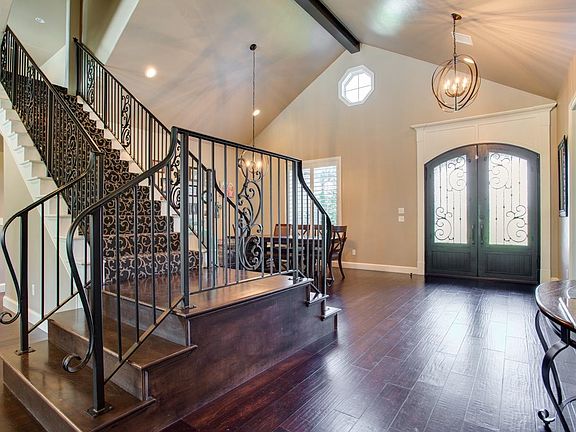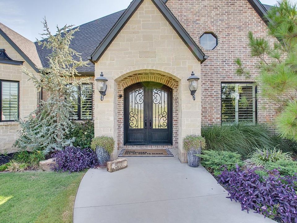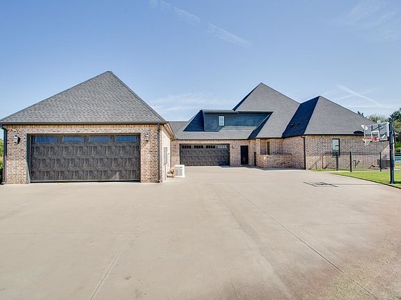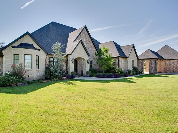 Luxurious private estate nestled on over 1 acre in a tranquil cul-de-sac in the Bridge Creek Addition. Surrounded by mature trees and nature this stunning home features 5 spacious bedrooms, 4 full bathrooms, and a half bathroom, offering ample space for family and entertaining. The primary en-suite boasts a relaxing soaker tub, large walk-in shower, double sink vanity, and a generous walk-in closet. 3 other bedrooms are located on the main floor. 2 have a Jack N Jill bathroom and one features an en-suite. The gourmet kitchen is a chef’s dream with two islands, two dishwashers, double ovens, propane cooktop, microwave, stand-alone ice maker, and walk-in pantry, all overlooking the breakfast nook and living room.. A dedicated office, and a stunning living area with a gas log fireplace and spectacular views of the outdoor patio, and spacious laundry room with sink and built in folding table and rack finish off the downstairs. Upstairs, you'll find a large movie room complete with kitchenette, the 5th bedroom, a full bathroom, and a spacious balcony overlooking the pool. An ideal space for family fun and entertaining. Outdoor gatherings are easy to enjoy with the outdoor kitchen, wood-burning fireplace, and overhead heaters. Relax and unwind in the backyard oasis, featuring an inground, heated, gunite swimming pool featuring two fountains, and spacious hot tub. Additional amenities include a 4-car garage with an in-ground storm shelter, in-ground sprinkler system, water well, and a Generac generator for peace of mind. This private, move-in ready estate offers luxury, comfort, and accessibility—all tucked away in a peaceful, wooded setting.