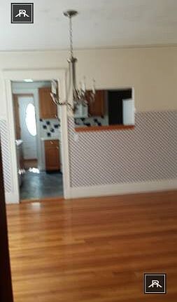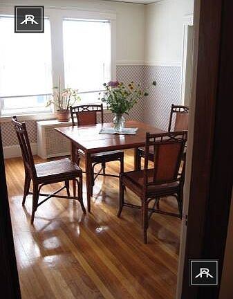 Dining roomHardwood floorsBackyard with pondFree laundry in basementEqual sized bedrooms