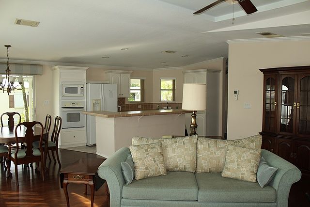 You are going to love this expansive home with a great room concept, vaulted ceilings, tower dormer and transom windows providing abundant natural light. Laminate flooring throughout the main living area and hallway, tile in the kitchen/bathrooms and new carpet in the bedrooms. Desirable island kitchen includes vegetable sink and glass top range. The kitchen also contains a built-in microwave, wall oven and pantry. French doors leading to the study/office. Master suite has a huge walk-in closet and the bathroom contains a soaking tub and walk-in shower. Raised screened lanai has tile floor & ceiling fan. Bonus covered patio area and convenient back patio for grilling up your favorite meals. Retractable screen for the front door. Extra large carport and driveway can accommodate several cars. This home is in a great location close to community amenities! Lush landscaping. Shingle roof. Easy care vinyl siding. *Partially furnished, freezer in shed not included. This home is in a very active, 55+ community with many clubs, sports and activities for the residents. Amenities include two swimming pools, three clubhouses, hot tub, sauna, state-of-the-art fitness center, library, billiard room, shuffle board, tennis courts and pickle ball courts. HOA fee includes: site lease, water/sewer, trash/recycle, lawn mowing, basic cable, 24 hour attended gatehouse and access to all community amenities.