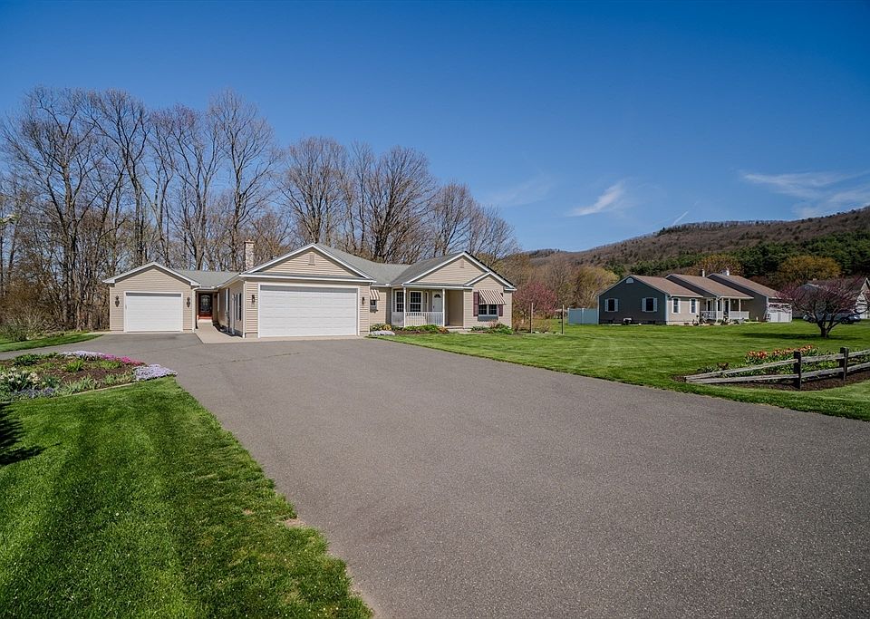 AN ABSOLUTE MUST SEE!! 2,900 sq ft Ranch Style home impeccably maintained & tastefully update over the years! Step inside and be wowed by the open floor plan featuring a Gorgeous new kitchen w/white cabinetry, granite counters, Large center island & tiled backsplash that opens to the amazing living room w/cathedral ceiling, h/w floor, recessed lighting, wood stove & 3 skylights. Included in the sq footage is a 1st flr, 1000+ sq ft 1 bedroom accessory/in-law apartment added in 2008. This Amazing space features a granite kitchen w/SS appliances, recessed lights, cathedral ceiling & 1st flr laundry. Other great features include a main suite w/full bath & walk-in closet, 2 car attached garage w/main home & 1 car attached garage w/in-law, front porch, gas heat & h/w(2 Buderus boilers), central air, freshly painted interior and a Great 23X17 composite rear deck overlooking the private yard w/Spectacular Mt View and abuts the Manhan River! LEASED SOLAR PANELS = NO ELECTRIC COSTS UNTIL 2031!!