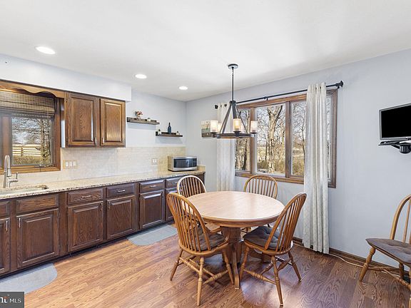 Rurally situated behind a faint tree line sits this 3 BR Raised Ranch Home on a sprawling 1.46 acre lot. Surrounded by expansive estates and farms it's easy to enjoy the connection to nature. From the moment you arrive, you will feel the simplistic and classic charm as you walk past the rocking chair front porch. Upon entry, you can see the inviting hearth in the Living Room with generously sized windows offering both relaxing views and abundant natural light. The spacious Eat In Kitchen features solid wood cabinetry, new granite counter tops, stainless steel appliances and wood floors. The picture window exudes morning light for a delightful breakfast setting. The Main level continues with 3 generous sized bedrooms including a Master Suite with Full Bath and Walk in closet. All Bedrooms have built-ins and there's a beautiful renovated hall bath. The lower level boasts a versatile living space blending recreation and relaxation. The 18 x 21 Family Room offers a cozy fireplace, bar area and sliding glass doors that walk out to the hardscape patio. Indoor/Outdoor entertaining is a breeze with the hardscape patio, deck, pool, backyard space and the relaxing views of the wooded backdrop that buffer a creek. Ample 25 x 7'11 storage room, utility room, laundry room and garage access complete the lower level. The 2 Car side entry garage is equipped with a work area and storage shelves. There are many updated systems in this move in ready and lovingly maintained home. Conveniently located to major routes, train station and scenic country back roads. First time offered for sale since built by the original owners in 1980.