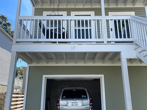 Drive under porch into one-car garage, interior stairs lead up from garage to living area.