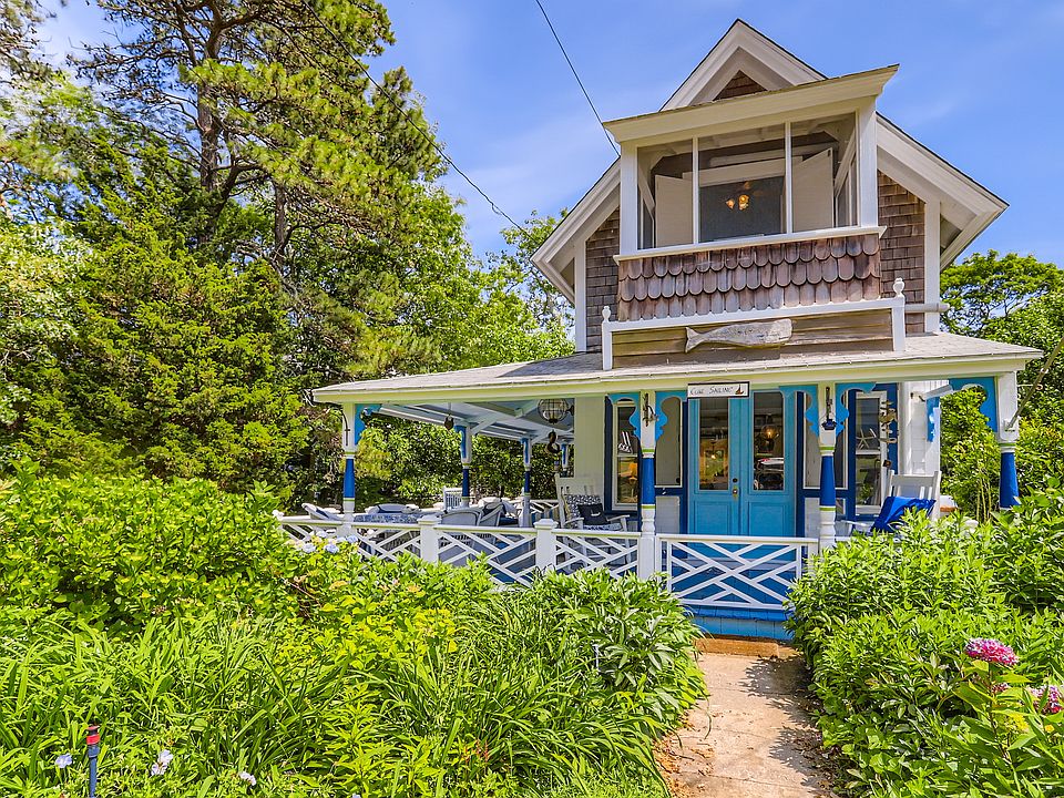 Welcome to this year-round East Chop Victorian Gingerbread home, close to Oak Bluffs Harbor, Jetty Beach, and downtown. The amazing wrap-around porch is perfectly designed for spending lazy summers with friends and family. Many a party has been hosted on this generous porch, made more enticing by an open-plan first floor with a large kitchen, living room, and dining area. The first floor features Victorian charm, featuring a beautiful stained glass window, painted beam ceilings, wainscoting, and built-in shelves. The second floor has 3 bedrooms, each with its own character, including a generous primary bedroom suite with vaulted ceilings, skylights, a walk-in closet, plus a full bathroom and an extra built-in closet. The 2nd bedroom has an open and airy feel with a vaulted ceiling and a screened porch affording views of the neighborhood. The final room has its own private balcony for viewing the backyard garden oasis. The lower level consists of a finished bonus room, laundry, and a full bathroom with tub and storage area. This home and its established gardens have been lovingly maintained, and its location in a delightful neighborhood of highly sought-after East Chop, gives you all that Martha's Vineyard living can offer. Passed Title V Inspection.