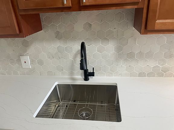 Mosaic backsplashWaterfall quartz countertopsIn-unit laundry