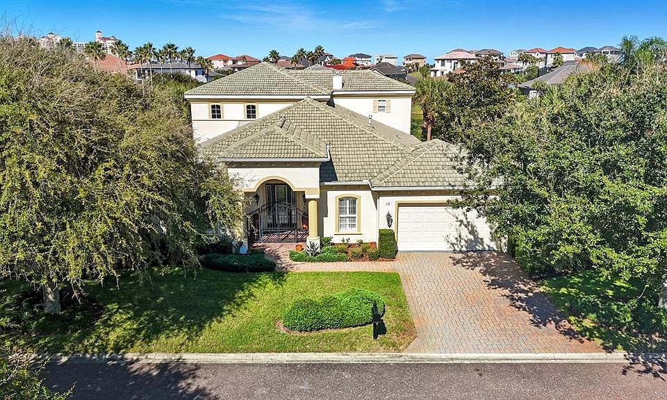 Traditional, understated elegance in this beautiful LAKEFRONT HOME in the Oceanfront Resort Golf Community of Ocean Hammock, in Palm Coast. On a culdesac street with approx. 1/4 acre facing a community lake, this property is a MUST SEE! Custom built in 2006, and in IMMACULATE condition, this home has some unique features that give it that "WOW" factor! A neutral palette of complimentary wall colors, upscale lighting & window treatments, 8’ raised panel doors, and gorgeous cherry hardwood floors set the stage for a tasteful, timeless design throughout the home. Upon entry there’s a clear sightline to the back of the house, lending a sneak peek at what’s to come! Behind the French Doors to the left is one of the bedrooms (with its own bath), utilized as a home office. The formal living & dining space is dressed to impress w/ soaring ceilings, stately columns, crown moldings, beautiful trim work and an amazing, coffered ceiling! The fireplace creates a warm & inviting atmosphere, and the adjacent dining room can accommodate a large gathering when entertaining guests. NEXT, your eyes are immediately drawn to the stairway with iron spindles & wood rails leading up to the LOFT LIBRARY. But wait…the KITCHEN is the REAL SHOW STOPPER! Dark wood cabinetry spans the entire side wall, and small sections of block glass set in the backsplash allow the sunlight to sparkle on the granite counters. The upscale stainless appliances, range hood and GAS grill-top stove make you stop & take notice, while the wall ovens and large center island just might entice you to stay home & cook! Adding to the appeal is a built-in desk area, large breakfast nook w/ mitred glass picture window, and ANOTHER center island BAR with sink & icemaker! NOT TO BE OVERLOOKED is the oversized double door refrigerator, walk-in pantry, AND a fabulous Butler’s Pantry with the same tasteful granite & wood cabinetry w/ glass doors to display your finest dinnerware! The family room has its own touch of WOW, showcasing a double set of sliding glass doors that open from the corner creating a large opening to the lanai, presenting an unobstructed water view and seamlessly bringing the outdoors in! THE LANAI is a definite contender for THE MOST FABULOUS FEATURE!! Covering the full width of the house & wrapping around the side, this space offers SPECTACULAR WATER VIEWS, and is a great place to relax & unwind or enjoy the company of family & friends. The primary en-suite is on the main level and is quite spacious w/ seating area, access to the lanai, and an amazing walk-in closet that’s custom configured for organizational storage. The bath is well-appointed with two large separate vanities, a luxurious garden tub, oversized shower and private water closet. Another custom design feature is the unique & convenient connection from the primary en-suite directly into the laundry room (with a separate entrance from the house). Every bedroom is an En-Suite, and there's a powder room on the main floor as well. The upstairs bedrooms are separated by a gathering space in the loft, and a covered screened-in balcony with more beautiful views! The oversized garage is approx 30 x 18 and has additional storage space, with access to the attic as well. *The freezer and wine frig under the stairs, the firepit on the lanai, and the invisible fence surrounding the property will all convey with purchase. *Water Heater, Fireplaces, Cooktop & Outdoor Grill work on Propane. HVAC=2017 (2 units, 4 zones).