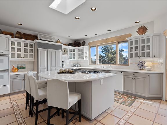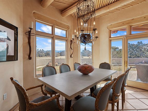 extraordinary custom home in fabulous guard-gated La Tierra Nueva! Enjoy an “other world” feeling in this beautiful location, on 11.9 natural acres only a beautiful 15 minute drive to the Santa Fe Plaza! Featuring a thoughtful single level plan with resort like charm, beautiful architectural details, and spacious rooms with high ceilings, vigas, and abundant windows throughout. Thick plastered walls and a flowing floor plan create a feeling of warmth and belonging. Off the front entry, you’ll enter a large and beautiful living room with 11’ ceilings, a kiva fireplace, an adjacent glassed dining room, and plenty of space for artwork. A gallery hallway featuring all glass on one side links to the media room/den, with kiva fireplace, built-in seating, and direct access to the front portico. The large island kitchen opens to den, with an oversized island with seating. The luxurious owner’s suite features direct access to a private patio, kiva fireplace, spa like bath, jetted soaking tub overlooking the mountains, and a spacious walk in closet. The other end of the home has a private guest suite with it’s own views and bathroom. The home’s outdoor spaces are equally impressive, with an east-facing portal offering sweeping views of the Sangre de Cristo Mountains, and a west-facing portal takes in the grandeur of the Jemez Mountains. A separately entered studio can easily be transformed into a fourth bedroom/casita. This subdivision is great for horses and their owners, ride on your lot or trot to nearby BLM land. The Club at Las Campanas is nearby. La Tierra Nueva offers a ranch like feel just a short drive to world class art, dining, symphony, opera, culture, museums, golf, tennis, pickleball, biking, skiing, and the clean air and sunny skies that make Santa Fe famous! Watch the property tour video; however, this magnificent property must be experienced in person.