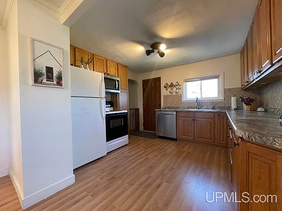 This move-in ready home in the Village of L’Anse has received numerous updates over the past few years, making it a modern and welcoming space. Key improvements include new paint, flooring, trim, doors, and lighting throughout the home. The plumbing, waterlines, and electrical systems have all been updated to every part of the house. The open floor plan allows ample natural light to flood the home, creating a bright and airy atmosphere. The kitchen, open to the dining room, features new laminate flooring, countertops, sink, faucet, and a new dishwasher. The spacious bathroom is conveniently located off the dining room and provides access to the primary bedroom. An additional room off the dining room is currently used as a bedroom but could easily function as an office if extra bedroom space is not needed. The fully finished attic is utilized as a children’s playroom and storage area. There's also an 8x13 room on the second floor, which can serve as an additional bedroom if required, though the ceiling height at the center is 6.4 feet. The breezeway connecting the home to the 1 car garage is spacious and very clean, providing a convenient entryway into the basement, where the laundry is located. The walk-out basement offers easy access to the backyard. The backyard is a delightful retreat, featuring wildflowers and beautiful lupines. Don't miss out on this charming, updated home in the heart of the Village of L’Anse!