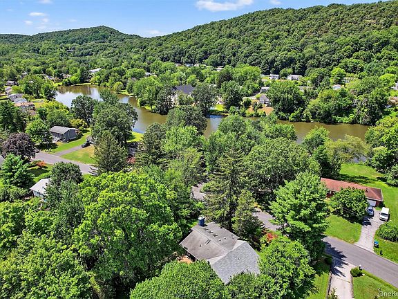 Nestled in nature, welcome to your private sanctuary in the heart of the highly desirable Merriewold Lake community in South Blooming Grove—where serenity meets thoughtful design and comfort. From the moment you arrive, the attention to detail is unmistakable. The home’s inviting front elevation features a covered porch with solid mahogany decking and recessed lighting—creating a warm and alluring first impression. A wide mahogany staircase leads you inside to an expansive and breathtaking living space. The great room is a showstopper: soaring vaulted ceilings with skylights and motorized shades bathe the room in natural light, while dramatic walls of windows bring the outdoors in. Rich oak hardwood floors with radiant heat provide comfort and sophistication year-round. A wood-burning fireplace with a marble surround and slate raised hearth extends along the wall, offering built-in bench seating—perfect for cozy nights and relaxed conversation. Ceiling fans and recessed lighting complete this truly spectacular living area. Flowing seamlessly from the living room is the formal dining room, bright and spacious with an airy openness that’s ideal for hosting or everyday dining. The kitchen offers granite countertops, quality cabinetry, a breakfast area, and direct access to the covered side patio—a versatile space that invites year-round outdoor entertaining, grilling, alfresco dining, or morning coffee in the fresh air. The primary suite is a peaceful retreat featuring vaulted ceiling and an updated ensuite bathroom. Enjoy the luxury of a spa-inspired shower, double vanity, and radiant heat tile floors for a restorative experience every morning. Two additional bedrooms are well-sized and filled with natural light, sharing a full hall bath. Need a home office or creative nook? A transitional flex space offers flexibility and function, complete with sliding glass doors that lead to a rear deck overlooking a lush, level yard bordered by wooded land owned by the Village of South Blooming Grove ensuring an exclusive setting. Enjoy the tranquil sounds of the nearby stream and the natural privacy of this exceptional lot. Downstairs, the fully finished lower level expands your living space even further. Ideal for a media room, gym, guest quarters, or recreational area, this level also provides direct walk-out access to the covered carport and attached garage—a perfect setup for multi-generational living or a private guest entrance. Additional highlights include: solid oak hardwood floors throughout the home; newer furnace (2017) for peace of mind; side patio overhang (2020) for enhanced outdoor living; 200amp electrical service; ample storage and functional layout for today’s lifestyle; lake access within the community for recreation and scenic enjoyment with no HOA fees. Location, location, location: Situated just minutes from the NYS Thruway (I-87), NYS Rt 17, and the Palisades Parkway, you’re within easy reach of shopping, dining, public transit, and everything the Hudson Valley has to offer. Whether you’re commuting or working from home, this location combines convenience with natural beauty. This is a must-see!