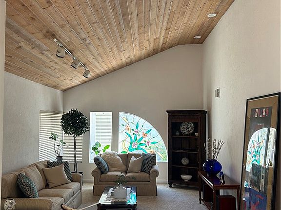 The home features soaring vaulted ceilings, abundant natural light, and an open floor plan that seamlessly connects the living and dining areas. A cozy fireplace warms the family room, while the kitchen is highlighted by granite counters, ample cabinetry, and a breakfast nook that opens directly to the inviting family space.