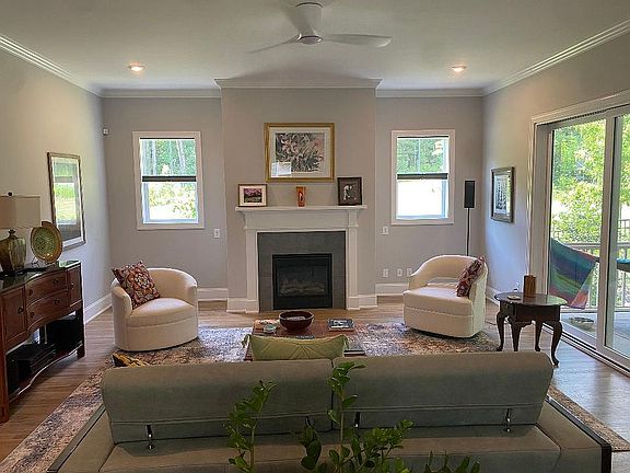This Dickerson Home was completed in December 2022 is contemporary with 10 ft ceilings and 8 ft solid doors at the first level and 9 ft ceilings on the second level. It has a spacious primary bedroom with a large walk in closet at the first level. The primary bedroom has direct access to the porch and also an expanded master bath with tile floors that has both a large glass shower with dual shower heads and a garden tub with windows overlooking the garden. An auxiliary water heater in the master bath provides instant hot water for the shower. The first level is primarily real oak hardwood floors with ceiling crown molding throughout. The open floor plan has a large kitchen island and a triple sliding glass door to the rear porch. The kitchen has ample modern cabinets, with a glass display cabinet, and undercounter lighting. The kitchen design was modified to include a large window over the single bowl sink and a drawer microwave in the center island. The library at the first level has double French doors with lots of windows. The laundry room is also at the first floor and the washer and dryer convey. Upstairs is fully carpeted and has two ample bedrooms with lots of window light and ceiling fans, one bedroom is attached to the bathroom. The larger 2nd bedroom has a walk-in closet. A study and TV room are also upstairs, as is additional closet space, as well as a large attic at level 2 just above the living room. The home has seven ceiling fans including the back and front porches. Water heat is tankless gas heat, while home heat is gas and AC is electric. The back yard is quite large for the neighborhood with a 5 ft aluminum fence/three gates, perfect for a family dog. The garden is young, with azaleas, camillias (sansanqua and japonica), virburnum, osmanthus, hydrangea, japanese maples, forsythia, tulip magnolia, butterfly bush, redbud, dogwood and ginko. Hundreds of daffodils are naturalized throughout the yard to herald in spring. The backyard backs into the greenway of the neighborhood with miles of natural trails and mountain bike paths along several creeks, perfect for trail running, walking the dog, or off road cycling (no horses). For a longer walk, check out the beaver pond and you may see blue heron, otters and other wild life, or discover the small waterfall. Briar Chapel is a planned community with groomed easements, a clubhouse, pool and has restaurants adjacent to the neighborhood.