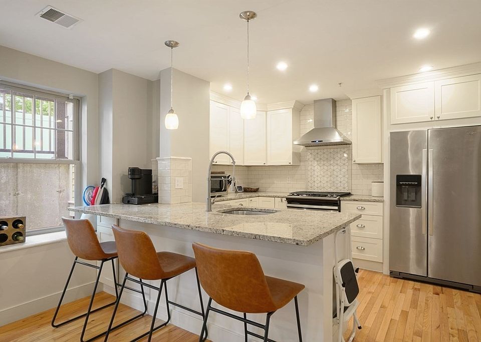 Open houses Saturday 9/27 & Sunday 9/28 from 12PM-2PM. A stone’s throw from downtown Canton with shopping, restaurants, and a commuter rail stop, this lower-level unit built in 2017 offers easy, modern living. Large windows in each room and high ceilings allow for great natural light. The kitchen features granite counters with a generous kitchen island, full-height custom cabinets, Whirlpool appliances, and adjacent washer/dryer hook-ups. The bathroom features a marble tiled shower with tub and modern tile plank flooring. High-end, durable finishes continue outside with Hardi board siding, copper gutters, and composite fencing. This unit has two exclusive-use patio areas: one adjacent to its front door, and one at the rear of the building which is perfect for grilling. Updates during ownership include tankless hot water heater, vinyl privacy fence, arborvitae trees, Google home with smart switches, Nest Doorbell & Thermostat, Ring cameras.