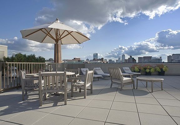 This is a truly lovely residence at One First Condominium that offers an incredible convenient location to Lechmere, Kendall Square, Harvard Square and Boston. Unit boasts open living and kitchen area with soaring ceilings and private balcony. The kitchen has cherry cabinets with stainless steel appliances and granite counters, It has two generous bedrooms and two updated bathrooms with granite counters. There is a washer and dryer in the unit. This impressive and elegant building has a 24 hour concierge, a lovely spacious inner garden, and an incredible roof deck that offers city views. Also includes a fitness room, a stately library and garage parking for $350/month