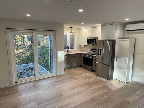Beautiful home for rent within walking distance to Portsmouth and the Kittery foreside district. The first floor features kitchen with all modern appliances including dishwasher. Half bath and slider door to private fenced in yard and patio. Second floor features washer dryer unit and two bedrooms with a full bathroom. Mini split A/C and heat on both floors. This is a non smoking rental. No dogs. Utilities not included (electric, water, sewer). Dead end road with nature trails.