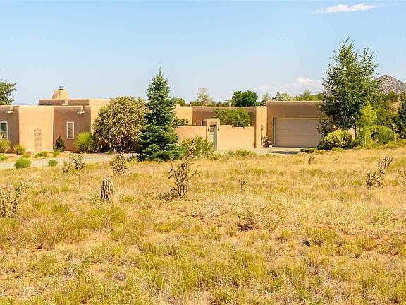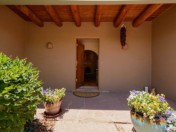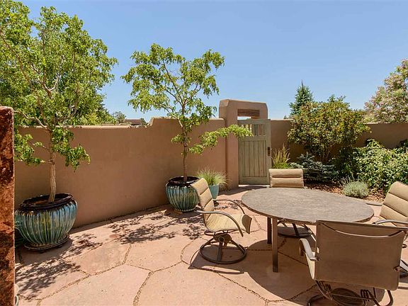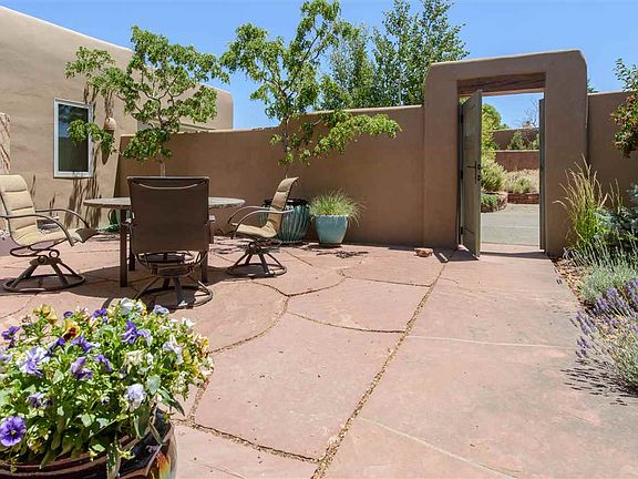 Fabulously refreshed and updated Adobeworks home bordering a lovely Eldorado greenbelt. Come home through a totally private walled courtyard patio, with a water feature, before entering this gracious open plan, split-bedroom design. The foyer flows to a Santa Fe style great room with center fireplace, viga beams and gleaming saltillo tile floors. Dine formally or watch the sunset from an entertainer's flagstoned portal. Enjoy cooking in a chef's kitchen with top appliances, built-in wine rack, ample prep space and walk-in pantry. Romantic owner's suite with lovely remodeled bath, dual-head shower and walk-in closet. Relax in the added large bookcase-lined den or studio. A west portal overlooks the privately walled richly landscaped gardens to wonderful western and northerly mountain sweeping vistas. New stucco and paint, oversized garage, plus paved driveway. All this is close to Eldorado amenities, senior center, library, parks, school, gym and two local shopping centers.