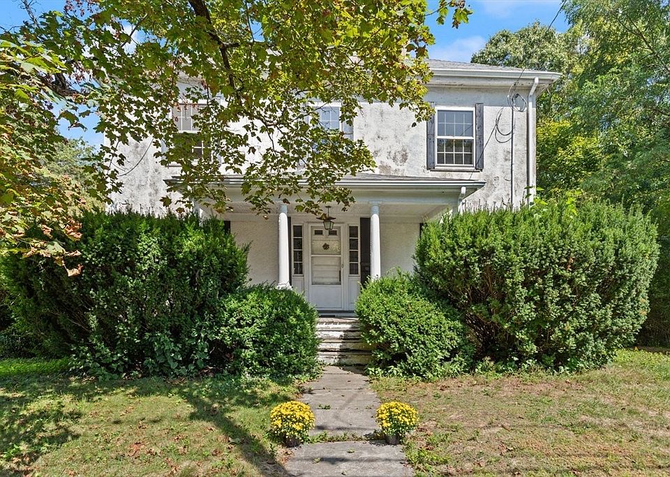 Welcome to this CLASSIC mid-century center entrance colonial brimming w/CHARM & PERIOD DETAILS & featuring a trad'l floor plan just WAITING TO SPARKLE AGAIN! This SUNDRENCHED 4-bedroom, 1.5-bath home offers SPACIOUS living w/HARDWOOD floors & BEAUTIFULLY BEAMED ceilings. The INVITING living room boasts a FIREPLACE & CUSTOM built-ins, while the formal dining room leads right to the eat-in kitchen, perfect for entertaining. Enjoy warm evenings on the classic front porch or explore the potential of the unfinished attic & basement—ideal for future expansion. A detached 2-car garage adds convenience, & its PREMIER LOCATION places you close to town center, restaurants, houses of worship, shops & train. W/solid bones & ARCHITECTURAL CHARACTER throughout, this home is ready for your personal touch & updates to make it truly your own. Seller to install NEW 4-BR SEPTIC prior to close. SOLD AS IS. A rare opportunity to own a piece of history in a sought-after neighborhood! A FABULOUS OPPORTUNITY!
