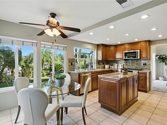 Welcome to this beautiful tropical themed home with 4 bedrooms and 3 baths! This floorplan offers a convenient MAIN FLOOR BEDROOM and REMODELED FULL BATH! Bright and airy feel, perfect for entertaining! Spacious living room and adjoining dining room with soaring ceilings and large slider doors that provide seamless access to the backyard oasis. The renovated kitchen features quartz countertops, upgraded cabinetry with convenient pantry pull-outs, recessed lighting, a central island, and top-of-the-line stainless steel appliances. The kitchen flows into a cozy dining nook and a generously-sized family room with a gas fireplace including a custom stone mantle and built-ins. Luxurious primary suite, complete with DUAL WALK-IN CLOSETS and a spa-like bath with a dual vanity, separate tub, shower, and HEATED TOWEL RACK. Two additional bedrooms are also on the upper level, along with a beautifully updated full bathroom featuring a new tub and a rain glass enclosure. Professionally hardscaped backyard, designed for both relaxation and entertaining, includes a STONE BBQ BAR, long grassy yard and a large seating area to enjoy the picturesque HILLS VIEWS. The side yard has a gated dog run area as well. The 3-CAR GARAGE offers workbenches, cabinets, overhead storage, and a newer water heater. Great schools, cool breezes, and just minutes from pristine beaches and DANA POINT HARBOR, this home offers the perfect blend of comfort, style, and location!