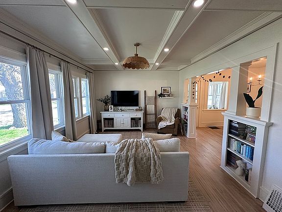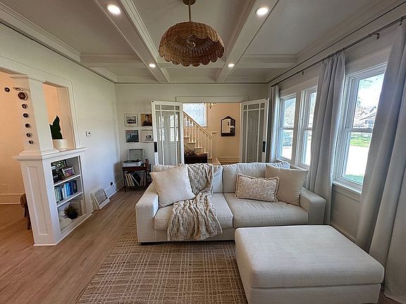Refinished wood floors and coffered ceiling with new recessed lighting.