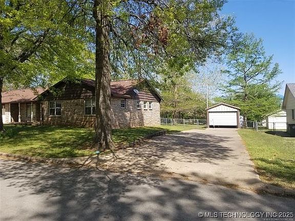 This charming native stone-exterior house is nestled in an established and quiet neighborhood near Bristow Lake. 3 bedrooms, 2 full bathrooms, 2 living areas, fireplace, vaulted ceiling and over 2000 square feet of living space. Nice utility room with storage and an office/hobby room. 2-car attached garage, a detached garage, a storage building, and a shed, offering plenty of space for all your tools, projects, and hobbies. The .42+/- acre lot features mature trees, a storm shelter, fully fenced and has a big deck for entertaining! Less than 30 minute drive to Tulsa. This house has great potential to customize and truly make it your own!
