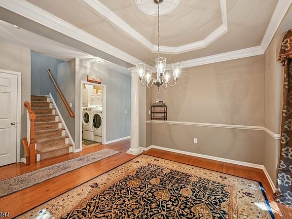 WOW! Meticulously Carlyle model Toll Brothers End Unit townhome (appox. sq ft 2086) on a premium lot in one of Mt. Olive's most desirable neighborhoods " This premium lot borders Green Acres protected woodlands. This sun-drenched home has a grand 2 story entry with exquisite chandelier, 3 beds, 2.5 baths and one car garage. The large primary BDR boasts a vaulted ceiling, large walk-in closet and an en-suite with large oversized 6' tub. The open floor plan is accented by abundant windows, w/ views of the woods, a gas fireplace, dining room with tray ceiling and bay window that fills the space with natural light. The EIK and family room are perfect for gatherings. The kitchen boasts a beautiful skylight and beautiful oak cabinets(soft close) and granite countertops with access to a Composite Deck overlooking a peaceful backyard plus a gas line for Grilling with a Weber grill included. Entire first floor displays hardwood flooring, while the upper level is completely, newly, carpeted. The laundry room has both gas & electric hookup for the dryer. Home includes owned, water softener system with additional water filtration system. Large unfinished basement with10'ceilings presents perfect opportunity for future expansion and walkout to backyard and woodland.Don't miss this opportunity to own a home with Resort style living in a great community that offers an array of lifestyle options including gym, pool, tennis, basketball, volleyball courts and clubhouse!