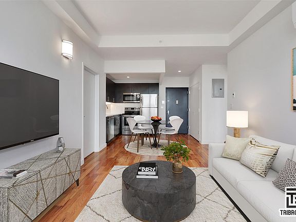 The open living and dining space is bright and inviting, featuring hardwood floors, recessed lighting, and oversized windows that flood the room with natural light. The stylish kitchen is equipped with stainless steel appliances, stone countertops, custom cabinetry, and a full-size dishwasherideal for both cooking and entertaining.
