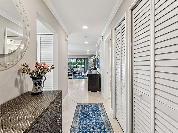 This spacious first-floor apartment boasts 2 bedrooms w/ a conv. 3rd bed/den & showcases elegant crown molding throughout, creating a luxurious atmosphere. The living areas feature neutral tile flooring, offering both style & easy maintenance. Step into the updated kitchen, where quartz countertops & tile backsplash complement stainless steel appliances. A large pass-through enhances the flow of the space, perfect for entertaining guests. Sliding glass doors from the kitchen & dining room lead out to the open patio, great for bbq, golf cart parking. Impact Glass enclosed Florida Room for year-round enjoyment & stunning views of the championship South Golf Course .Don't miss the new doors and hardware. Luxuriate in the Updated Bathrooms. Steps to the Southport Pool & short walk to HR