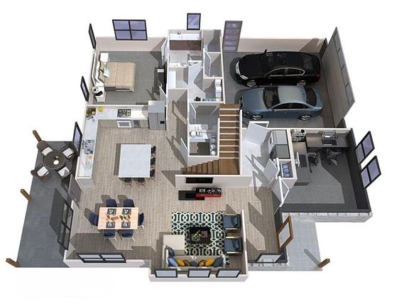 Water closet for privacyBold elevated rooflineInviting front porchDouble vanityStone-accented exterior