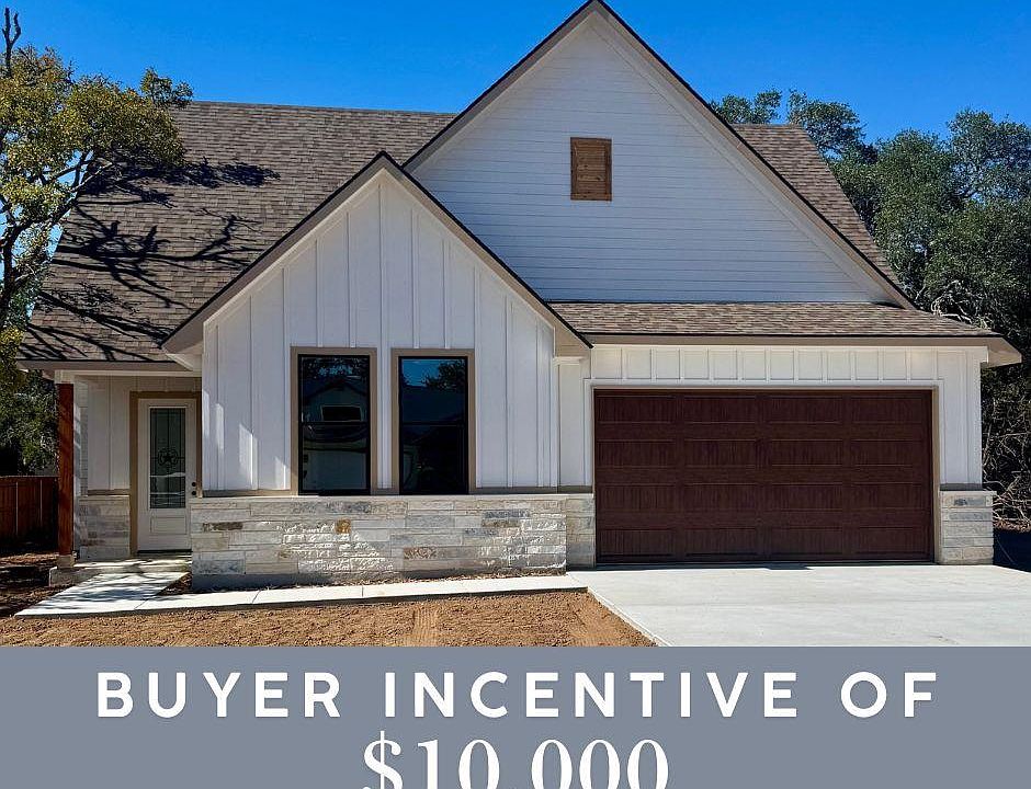 Completed Modern Farmhouse on Oversized Lot on a Cul-de-Sac Street with Majestic Oak Trees - professional photos coming soon! This modern farmhouse stands out with its bold elevated roofline, stone-accented exterior, and inviting front porch - all set on a quiet cul-de-sac surrounded by towering oak trees. Offering over 2,000 sqft of thoughtfully designed living space, this 1.5-story home includes 3 bedrooms, 2.5 bathrooms, and a dedicated office showcasing cathedral ceilings - a standout feature rarely found at this price point. Situated on a spacious 0.275-acre lot, the property provides privacy, outdoor living potential, and an elevated sense of space - while still feeling connected to community. Inside, the open kitchen features butcher block countertops and overlooks the living area, creating a warm, natural flow perfect for both everyday living and entertaining. The primary suite on the main level offers a frameless glass walk-in shower with bench seat and custom tiling, spacious walk-in closet with custom shelving, water closet for privacy, and double vanity. Upstairs, the secondary bedrooms are generously sized and tucked away for privacy with a full bathroom in between the two rooms. The deep covered back patio extends your living space outdoors - ideal for relaxing in the shade, hosting gatherings, or enjoying Hill Country evenings under the oak canopy. Now complete and move-in ready, this home combines modern style, quality craftsmanship, and an exceptional lot with natural beauty. Enjoy all Wimberley has to offer with local shops, a variety of restaurants, and regular community events. You're under 25 minutes to Austin, San Marcos, Dripping Springs and Canyon Lake. Homes with this level of design and setting don’t last—schedule your showing today.