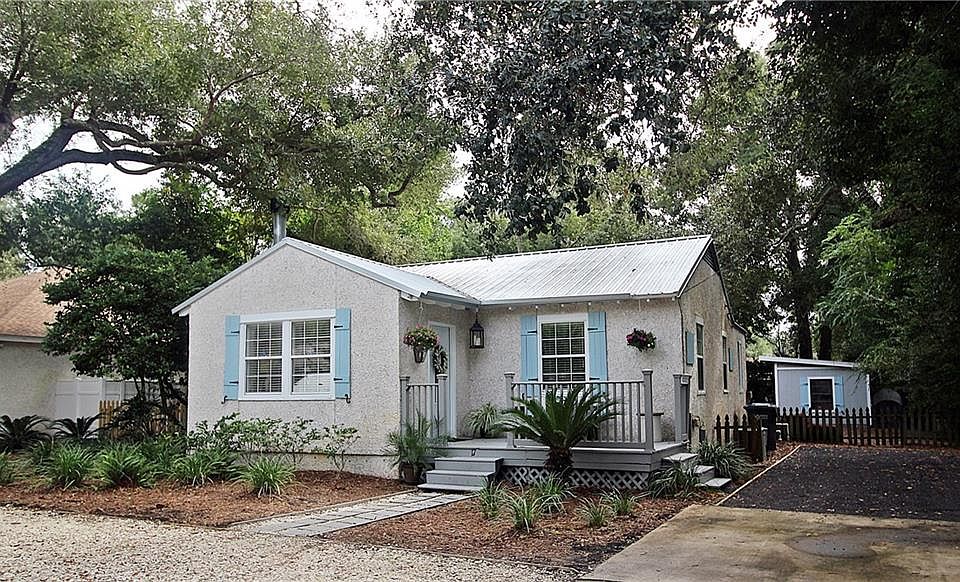 This adorable renovated Beach Cottage lives larger than it looks! It's open and bright with a large fenced yard, is in an X FLOOD ZONE & PRICED UNDER APPRAISAL! The mid-island location is convenient to shopping, restaurants and a short distance to the beach! This cutie has been very well done with an interior full of character w/exposed painted brick, shiplap, wood floors offering an open kitchen with stainless appliances. A large open foyer with Mexican tile & bookshelves for a perfect reading nook that welcomes you into the living room w/fireplace and French doors that open to one of several porches/decks. The outside areas are perfect for entertaining and truly are outdoor living spaces w/covered porches, decks, a fantastic fire pit and a private fenced back yard with mature grapefruit, orange & lime trees. There's even a workshop with electricity (12x24) and did I mention the new metal roof?! Don't miss this beautifully maintained & adorable cottage! Showings will begin Sat, 10/24.