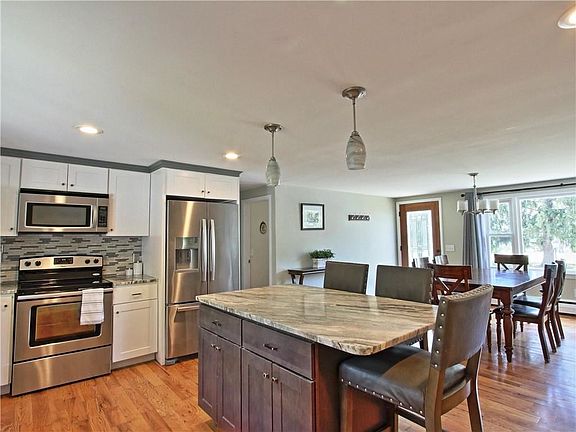 Not your average ranch! Exquisitely updated 3 bed, 1 bath home with a rare open floor plan. The front-to-back dining room and fully renovated kitchen lead to a very large sunken living room. From the living room, you can access the back yard and decide whether to hang out on the covered porch, or get some sun from the attached open deck. This home is close to town to make running errands a breeze, but on a quiet street with a big fenced in back yard. Full, unfinished basement for storage. Everything new including roof, heat, windows, kitchen, bath, and septic. Nothing to do but move in. Schedule your private showing today!