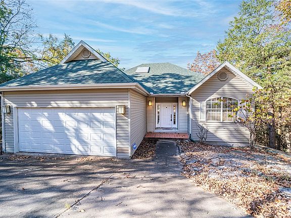 Contemporary home nestled in a peaceful, wooded neighborhood on one acre (+/-) and featuring an open floor plan perfect for main-floor living. Beautiful bamboo hardwood floors run throughout the space, and double doors open onto a large upper deck, providing great views of the Ozark Mountains. The kitchen is spacious and well-equipped, with plenty of counter space, a pantry, and a wood-burning fireplace visible from the entire open living area. The primary suite offers picturesque mountain views, along with a large soaking tub, separate shower, private water closet, and double vanity. Two additional main-floor bedrooms provide unique charm—one with a beautiful Palladian window and another with a skylight that floods the room with natural light. The expansive lower-level flex space includes a second wooden deck. This level also has a storage area or workshop, complete with a garage door for easy access. The attached two-car garage offers direct access to the laundry room and kitchen for maximum convenience.