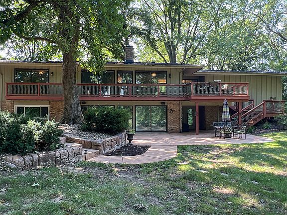 One of a Kind, Walk-out Ranch situated on an Incredible, Private 1.23 Acre, Lakefront Lot in Timberlake Subdivision! This rare find is centrally located, yet tucked away for the perfect amount of privacy vs conveniences, featuring sewer system & City water service, but County property taxes instead of City based. Stepping into the double french doors, prepare to be awed by the cathedral ceilings, hardwood floors and full wall of glass doors to the wraparound deck overlooking your gorgeous yard. A double-sided natural gas fireplace and warm exposed brick wall provides a cozy centerpiece between the living room & dedicated dining room area. Updated kitchen boasts custom cabinetry (including a tricked out pantry!), white subway backsplash tile, granite counters & newer stainless appliances (2024-25). This fantastic main floor also offers THREE generously-sized bedrooms, including a main floor primary with sliding doors to a private deck & ensuite with full bath. Enormous, walk-out lower level will WOW you...showcasing another full wall of glass sliders & windows for tons of natural light. A second fireplace highlights the large family room with half bath, leading to the theater room area, complete with a projector & screen. No entertainment space would be perfect without a sexy wet bar...finished with raised bar seating, beautiful cabinetry with under-cabinet lighting, bar sink, full-size fridge & space for a kegerator! Lower level includes TWO additional rooms...one features a huge walk-in closet & ensuite bath with jetted tub, dual sink vanity & tiled shower with 2 shower heads and multiple body sprays! (this room does not have an egress window) The other bedroom includes three closets and french doors that walk-out to your covered patio! Roomy laundry with storage, mudsink & sliding doors to patio. STUNNING backyard boasts sculpted & stained patios, built-in firepit, wrap-around deck, built-in gas line & grill, unbelievable views of lake frontage & landscaping, new mulch. Dual Hvac & dual Water heaters. LONG list of Upgrades available upon request. WH:2024. Sewer system:2022. Some windows:2021. Lower carpet:2025. Deck improvements:2025. Landscaping:2025. Projector & screen:2025. NEW Roof in July of 2025 with a transferable warranty!