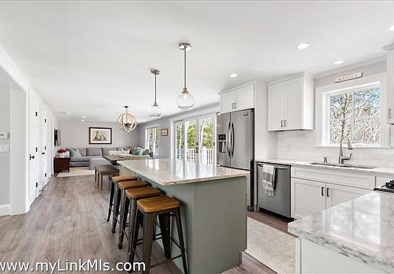 This gorgeous fully renovated cape in Tower Ridge has so much to offer! From the moment one steps in the door of this property, everything feels just right. The home has a beautifully open floor plan, with a central island kitchen with updated appliances and quartz counters. One side of the kitchen leads first to an open dining area, and onward to cozy seating/tv space. There is a primary bedroom suite on the first floor with a beautiful private bathroom. The first level also includes a second sitting room, mud room with laundry and a two car attached garage. Upstairs are two generously sized bedrooms that share the second full bathroom. The full basement is unfinished but excellent for storage. Above the garage is another ~400 sf that may be finished with permitting from the town. Outdoors there are comfortable front and back yards, a back deck and outdoor shower. Overall this is a superb offering that is well-suited for both year-round and seasonal use. The location is convenient to Farm Neck Golf Club and downtown Oak Bluffs, yet still private and quiet on nearly 3/4 of an acre. Furnishings are negotiable.