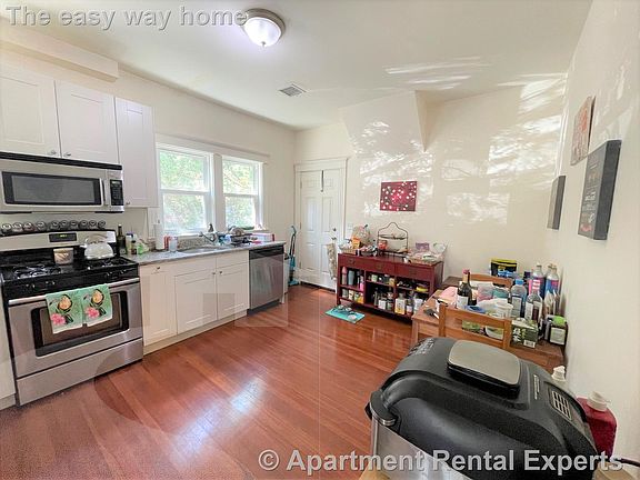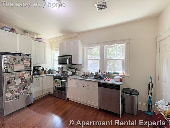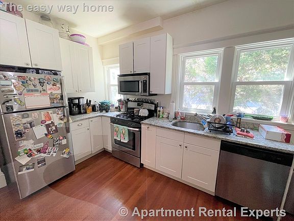 Located in the Magoun Square area of Somerville. Renovated 4 bedroom, 2 full bathroom apartment with a living room and formal dining room on the 2nd and 3rd floors of a two-family house. Modern eat-in kitchen with dishwasher, microwave, stainless steel appliances and granite counter tops. Laundry in unit. 2 or 3 off street parking spots are included depending on the size of the cars. (Reference #144447) Cats are negotiable. NO DOGS!!