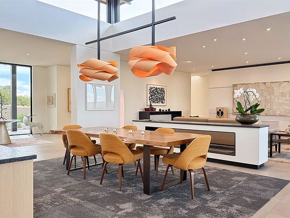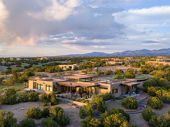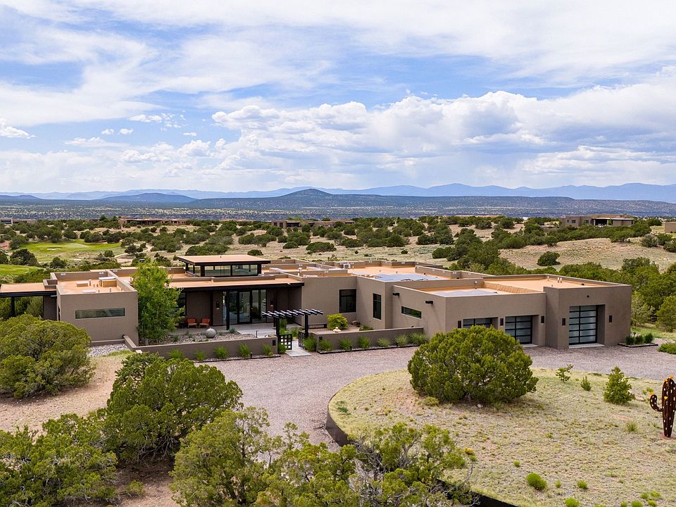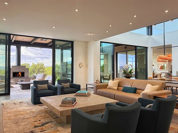 Wall Street Journal House of the Week featured 7/11/25. Artful design meets exceptional functionality in this striking contemporary estate, brilliantly conceived by renowned architect Lorn Tryk, and built by Prull Custom Builders. Resting on 4 acres, this home is a rare synthesis of modern form and high-performance living. A peaceful water feature welcomes you where a snow-melt walkway leads to a dramatic glass entry and gallery-style hall—perfect for displaying fine art. Inside, Tryk's “floating” walls, vanities, and cabinetry create a fabulous play of light and shadow. The dining room stuns with 17-foot clerestory ceilings, 72-inch EcoSmart fireplace, and floor-to-ceiling glass sliders opening to a heated portal, with in-ground hot tub, wood burning fireplace, and views of the Jemez and golf course. The chef’s kitchen is built to entertain. A wraparound layout conceals a butler’s pantry, while leathered granite counters, rift white oak cabinetry, steam and convection ovens, Sub-Zero wine storage, and a Grohe Blue seltzer system offer top-tier culinary tools. The primary suite is a sanctuary, complete with Ecosmart fireplace, in-suite gym, and a spa-style bath with walk-through triple-head shower. The guest wing includes two en-suites and a sitting area leads to a covered portal. For work and creativity, the home offers two distinct offices. One includes cabinetry with walnut countertops and a spacious craft table, while the other features skylights and massive storage for art supplies. This space could easily be converted into a fourth bedroom with bath. Smart home features include radiant in-floor heating and cooling and concealed media in the living room with sliding art panels to hide the TV. An integrated audiophile sound system by Linn operates in five locations. The three-car garage includes a dedicated RV bay and 50 amp EV charger. A truly distinctive property—thoughtfully designed, rich in detail, and purposefully built for elegant living and entertaining.