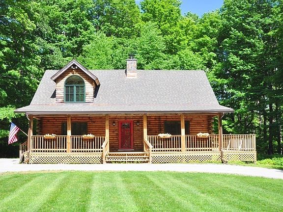 Elegant meets Country in this wonderfully refurbished log home located in Private Berkshire Lake Community. This welcoming and comfortable log home features; new Marvin windows and sliders, engineered hardwood floors, new bathrooms, new kitchen, whole house water filtration system and much more. Kitchen with granite counters, tile backsplash, SS appliances overlooks the open dining area with antler chandelier & sliders to the wraparound deck. The light-filled great room with vaulted ceiling, Floor to Ceiling stone fireplace with new wood stove insert. There are 2 large bedrooms with beautiful full bath to finish the 1st floor. 2nd floor has a large open loft and Master Suite sanctuary with vaulted beamed ceilings 2 closets. Master bath with double vanity, cast iron clawfoot soaking tub, walk-in shower and tile floor. Updates also include gravel driveway, roof, furnace, hot water heater and security camera system.