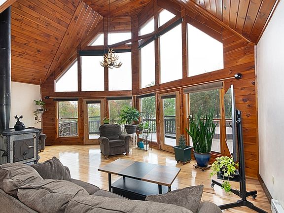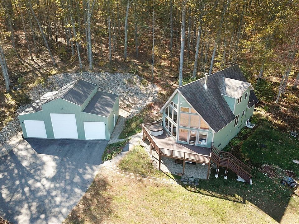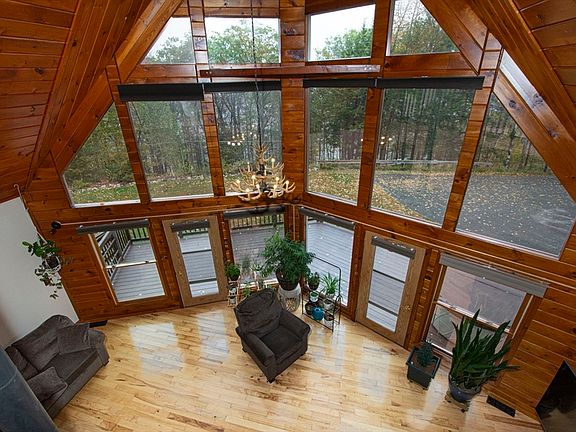 Stunning A-frame home overlooking Sunset Lake offers a rare blend of natural beauty, modern updates, and exceptional privacy. The moment you arrive, the floor-to-ceiling window wall captures your attention, perfectly framing views of the New England landscape. Expansive deck extends the living space outdoors, providing the ideal setting for entertaining, sun bathing, or enjoy the sun rising over the lake. Elevated above street level, property offers a sense of being connected to nature. Inside, the first level is highlighted by beautiful hickory flooring that flows through most of the 1st floor. The updated modern kitchen flows open to the dining area. Two comfortable bedrooms and a full bath complete the first floor. Cozy woodstove evenings with your favorite drink. 2nd level large loft bedroom full bath & office space, overlooking the living space & the lake. The lower level is partially finished in-law/aupair/guest suite. Store RV, truck, boat, in 3 bay OVER SIZED garage