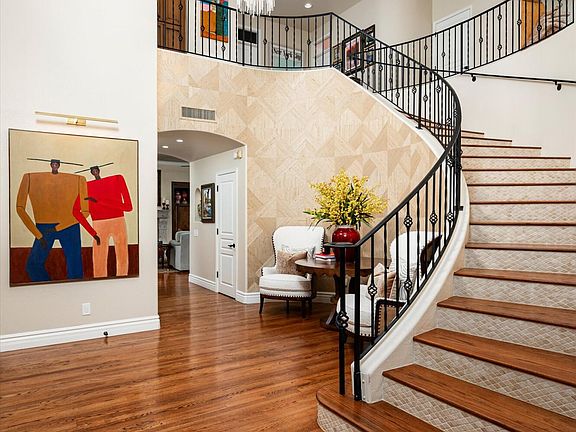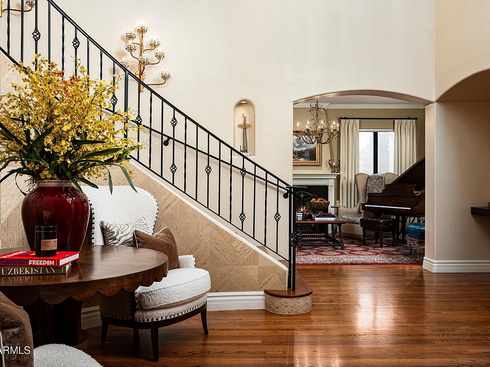 Upon entering, a dramatic staircase adorned with American Agave sconces set against 1 of 1 Philip Jeffries wallpaper greets you in the grand foyer, while a striking crystal chandelier sparkles above, immediately setting the tone for the home's timeless elegance. Designed for both grand entertaining and intimate gatherings, the thoughtful floor plan adapts beautifully to any occasion. On the west side of the home, the formal spaces include a warm and inviting living room with a gas fireplace, a richly detailed executive office, and a formal dining room with serene views of the pool and backyard retreat.