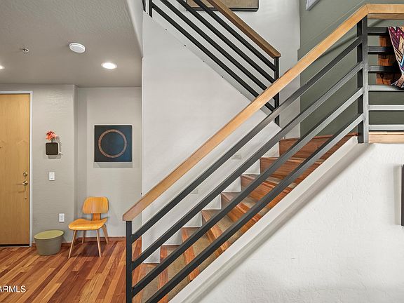 Discover urban living at its finest in this exceptional corner unit, ideally situated next to the historic Willo neighborhood. This rare floorplan, one of only four at Tapestry, offers a unique blend of modern design and function. Step inside to find stunning hardwood floors that flow seamlessly throughout the space, complemented by contemporary styling and numerous custom features that enhance the home's appeal. The heart of the home is the custom kitchen, equipped with modern cabinets and finishes, perfect for culinary enthusiasts and entertaining guests. The bathrooms are upgraded with floating cabinets, adding to the modern and stylish aesthetic. This corner unit's windows are enhanced by custom shutters throughout, providing both privacy and charm. Two assigned parking spaces in the secure parking garage and ample storage options, this property meets all your practical needs without sacrificing style. Enjoy the great location, with the Encanto light rail station just steps away. Other amenities include a beautiful heated pool and hot tub, fitness center, and clubhouse. Also, enjoy the convenience of a Walgreens pharmacy and nail salon on site. Don't miss your chance to call this unique residence home!