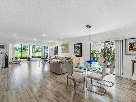 Step into luxurious living with this FULLY RENOVATED, 1st Fl, CORNER condo that dazzles with a white open kitchen & glamorous interiors. The home has FULL COVERAGE HURRICANE PROTECTION! The stunning kitchen features expanded cabinetry, quartz counters, deep drawers & a stylishly chic backsplash. The primary bth boasts a rejuvenating Jacuzzi tub, double sinks & a sleek glass shower. The glassed-in enclosed lanai has lovely west-facing golf course views & Florida sunsets. Or relax on your private garden side patio; ideal for open-air dining & golf cart storage. Embrace the epitome of refined living in this exquisite condo retreat. Located in Hunters Run Country Club, a mandatory membership, amenities filled community just minutes to lively Downtown Delray & the BEACH! Hunters Run Country Club provides a fabulous active & social lifestyle; featuring 3 golf courses, 18 tennis courts, 12 pickleball courts, teams, tournaments, a resort-style pool, poolside bar & dining, several other dining venues, a gym with trainers and classes, a spa & salon, entertainment, events, and so much more.