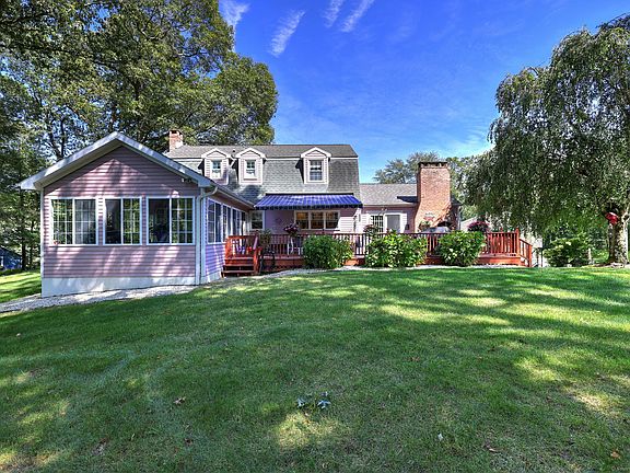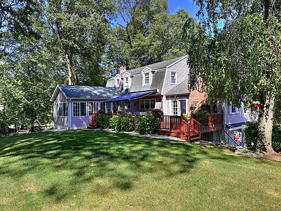 Discover timeless charm and modern comfort in this beautifully updated 3-bedroom, 2.1-bath Gambrel Colonial, ideally located north of Post Road on a quiet cul-de-sac. Set on a manicured 3/4+ acre lot with sprinkler system, this home offers privacy, space, and exceptional living both indoors and out. This beautifully appointed home offers three spacious bedrooms, including a luxurious primary suite with a private bath, and a total of 2.1 bathrooms, highlighted by a newly renovated main bath on the upper level. The updated kitchen flows seamlessly into the inviting family room, where a cozy gas fireplace and sliding doors lead to a deck-ideal for relaxing or entertaining. A formal living room and generous dining area open to a stunning four-season heated porch, complete with a wet bar and panoramic views of the picturesque yard. Outdoor gatherings are a breeze on the deck with its retractable awning, while the two-car garage and ample driveway space provide plenty of parking. With gas heat distributed across five zones, this home ensures efficient comfort throughout the year. This home blends classic colonial architecture with thoughtful updates and serene outdoor living. Whether you're hosting guests or enjoying a quiet evening on the porch, this property is a true retreat. Professional photos to come.