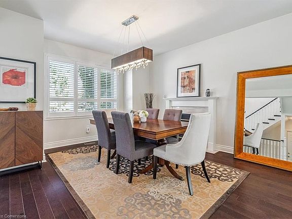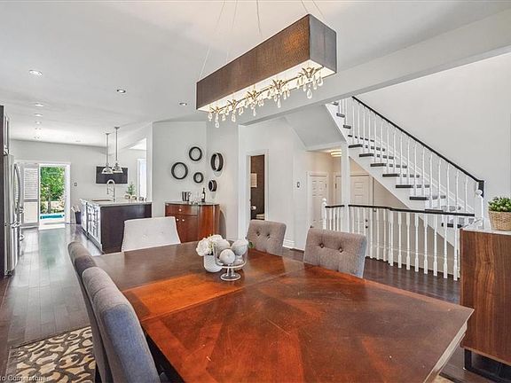 Nestled on a quiet street in Dundas and surrounded by serene conservation land, this beautifully renovated home offers a perfect blend of elegance and comfort. The open-concept main floor welcomes you with 9-foot ceilings, gleaming hardwood flooring and California shutters. This level contains a gourmet kitchen, a dining room with a fireplace, a 2-piece bathroom, and a spacious living room overlooking the backyard. Upstairs, the primary bedroom retreat features a walk-in closet and a luxurious 3-piece ensuite. The upper level also includes two additional bedrooms, a 4-piece bathroom, and a convenient laundry room. The spacious basement is perfect for entertaining, featuring a wet bar and ample room for family game nights or cozy evenings at home. The double car garage offers plenty of storage space and has direct access to the home and the backyard. Enjoy summer days in your very own private oasis complete with an inground heated saltwater pool, concrete patio and lush gardens. This home is a true gem with close access to schools, golf course, walking trails and downtown Dundas. Updates include: Pool liner (2023), Pool pump (2022), Upstairs broadloom (2019), Furnace (2018), AC (2018), Primary 3-piece ensuite (2018).