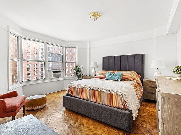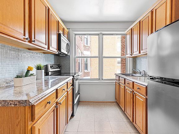 This bright and open unit features a large South-facing living room with treetop views, all new windows, and a spacious, eat-in kitchen with stainless-steel appliances. The king-sized bedroom features oversized bay windows, providing plenty of natural sunlight.