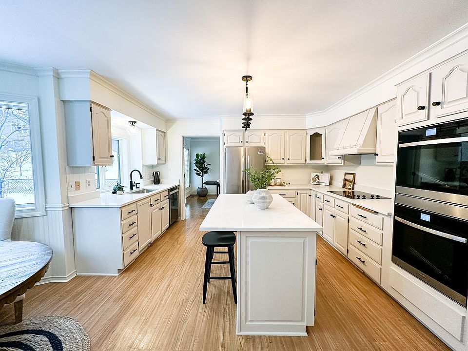 Nestled on a wooded lot, this spacious split-level home has charm and character throughout its four levels of living! The arched windows stream beautiful light into the living room with its tall ceilings and parquet flooring. The main floor has been updated with fresh paint, a modernized kitchen, new appliances, breakfast nook and quartz countertops. The formal dining room blends classic finishes (plantain shutters and a new light fixture) with the charm of a metal and brass railing. The upper level of the home features a primary bedroom with en suite bath and walk-in closet and 2 additional bedrooms. The lower level features a family room, with a built-in bar, patio doors, gas fireplace and wood paneling. And the home keeps going with an additional lower-level bedroom, add equity in the home by finishing an additional room on this level. There is plenty of storage in the lowest level. This home is close to many lakes, with walking/biking paths and seasonal activities.