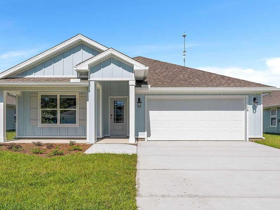Move in ready home is located at 170 Cades Court in Palmetto Bluff, a new subdivision in Port St. Joe, Florida. This home is situated on an interior lot. As you enter this 4 bedroom, 2 bath Cali floor plan, you will be greeted with spacious living. Inside you will see 8' ceilings throughout, engineered vinyl plank flooring throughout the home including the bedrooms. Beautiful granite countertops, white cabinetry and a spacious open living room and kitchen make this home perfect for having guests over. The kitchen has a large center island with cabinets underneath, ideal for serving food and extra storage. The kitchen also has a spacious pantry, and the stainless-steel appliances include smooth top range, microwave, and dishwasher.