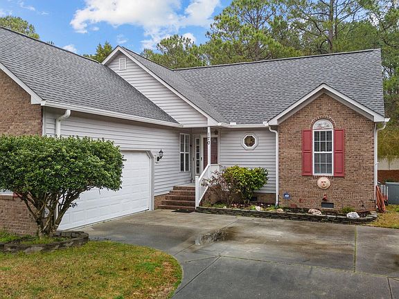Loads of Curb Appeal! Inviting front porch entry into the living area with laminate flooring, skylights and natural gas fireplace. The dining area is just steps off the kitchen and open to the main living area. The kitchen offers a great workspace perfect for visitng with company as meals are prepared. The main living area boasts a catheral ceiling and plenty of natural light. There is a breakfast nook that can easily double as an office area convenient to the kitchen. Enjoy the back sunroom with insulated plastic windows that is not heated or cooled and not counted in the heated living space. The sunroom has pretty views of the back landscaped area with a privacy fence along the back line and small dog fence for the pets. There is a side deck for morning coffee and a storage shed on the side of the house. Inside, the primary bedroom offers a high ceiling and a private entrance to the deck. There is a walk-in shower, double sink vanity and large walk-in closet in the master bathroom. Two additional and spacious bedrooms are on the opposite side of the home just right for guests. The main bath is steps away from the living area and the guest bedrooms. The home features an unfinished room above the garage that could be finished for added living space but perfect as is for storage and more. The 2 car garage has a work area and utility sink. The home is serviced by natural gas. River Bend is a wonderful community with a dog park, playground, community library, basketball court, park area and more. Beautiful Water Canal and River views can be had while walking. Convenient to historic downtown New Bern, shopping, the hospital, Cherry Point Air Station, Camp LeJeune and the North Carolina beaches. Come visit this Golf and Waterfront community and you will want to call it home! Buried propane tank is inoperable and home uses natural gas.