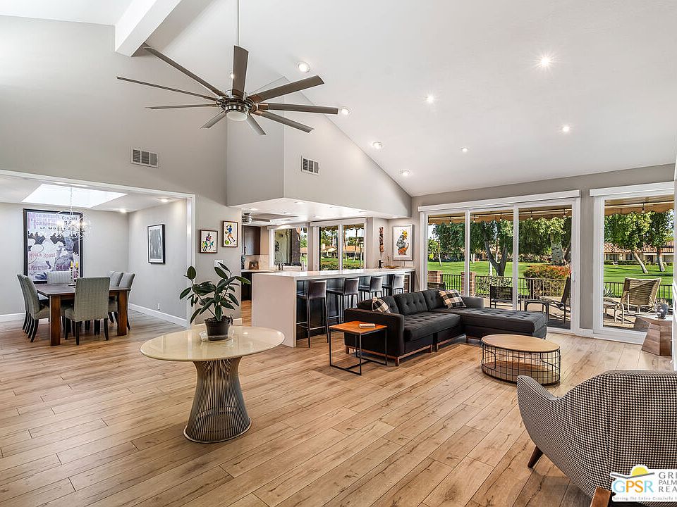 Welcome to your ultimate desert getaway in the highly desirable Monterey Country Club! This completely renovated 2 bedroom + Den, 2 bathroom condo combines modern luxury with serene living. Thoughtfully designed finishes throughout create a calming ambiance, making this home a true sanctuary. The main living space boasts soaring high ceilings, filling the home with an abundance of natural light and offering an airy, open feel. The beautifully updated kitchen features premium appliances, sleek cabinetry, and an elegant backsplash, perfect for cooking or entertaining. Both bathrooms have been upgraded with spa-like touches for ultimate comfort. Step outside to your private patio overlooking the golf course, where you'll enjoy breathtaking fairway views and peaceful desert sunsets. Whether sipping your morning coffee or hosting an al fresco dinner, this space is sure to become a favorite spot to relax and unwind. Situated in the heart of Palm Desert, Monterey Country Club offers resort-style living with 27 holes of golf, tennis, pickleball, fitness facilities, and multiple pools. Close to shopping, dining, and entertainment, this is the perfect place to embrace the desert lifestyle. Monterey CC allows Short Term Rentals which is a huge plus for owners looking to offset some of the ownership cost! Don't miss this opportunity to own a truly one-of-a-kind property in an unbeatable location. Includes all furnishings except for a few pieces of art! Golf cart is also available for purchase outside of escrow. Schedule your private tour today!