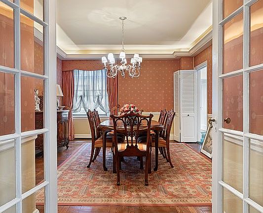 In the private wing, three bedrooms offer wonderful proportions and flexibility. Two capture sweeping southern vistas, while the corner third enjoys morning light from the north and east. High ceilings, original wood floors, and elegant prewar details give the home a sense of quiet sophistication.