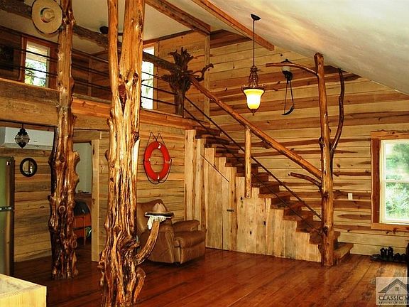 FOR RENT .. Mountain cabin located on private dirt road, but only 30 minutes to Athens with all its conveniences. Come see this unique custom built and a lot of it handmade home. The walk way to the front porch is laid rock from the area. Metal roof and double pane windows for energy efficiency. Most of the wood on front of the house and lining the walls inside came from and was cut with a saw mill right on the property. You have Leland Cypress, Cedar, Poplar and Pine. All of the doors and windows are edged in rich cedar with the bark for a rustic look. The covered front porch is a great place to sit back in your hammock and listen to the birds. Walk in the front door to the open living and kitchen with 12' ceiling plus a large loft area. The columns are finished trunks from Cedar trees. The wood floors are pine throughout except for the bath which is tile that follows into the shower. The bath also has room for the washer and dryer. Your sink has granite counter top. Inside you have country style wooden doors with special handles. The kitchen has granite and handmade butcher block counter tops. The custom cabinets and island give you room to work. The stove is gas and you have a country sink with a view outside. For a modern touch in your cabin the stair and loft rails are Leland cypress with metal piping. From the loft area step out onto the full length balcony where you're looking into the tree tops with a breeze. You also have a large pole barn with shelving, a well house and another smaller workshop that you can drive to. A basement area from outside with an enclosed room for storage. There is a garden spot up front and plenty of room to deer hunt in the back on your 4+ Acres. If you're looking for the simpler life to come home to, come take a look here.